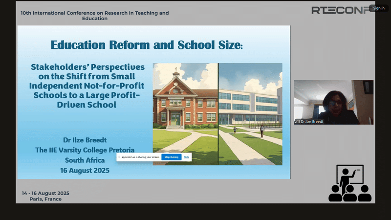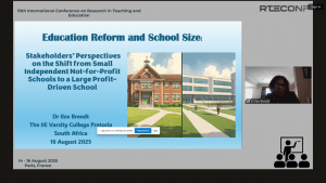 Dr. Ilze Breedt | Education Reform and School Size: Stakeholders perspectives on the shift from small independent to large profit-driven school | Varsity College, The Independent Institute of Education, Pretoria, South Africa | |